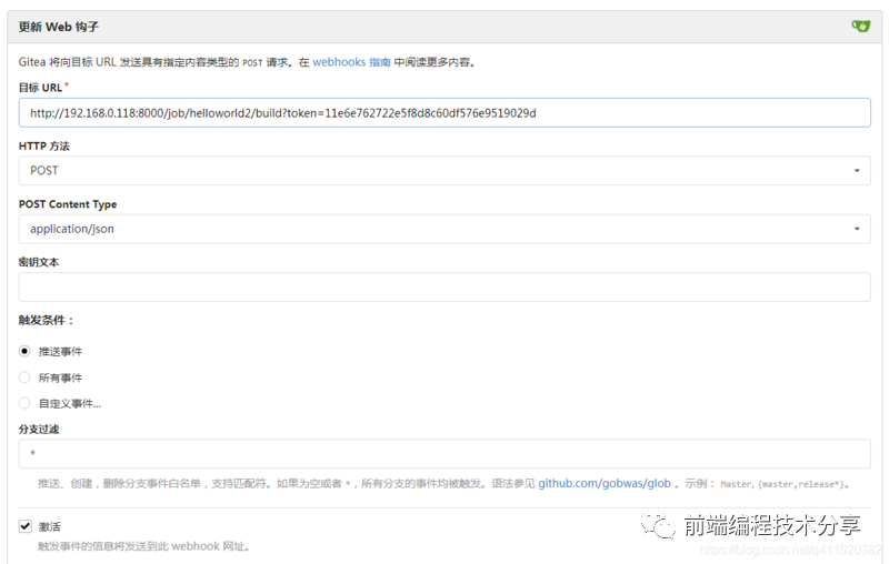 push操作时,Gitea 都会通过webhook发送一个 post 请求给 Jenkins,让它执行构建及部署操作。