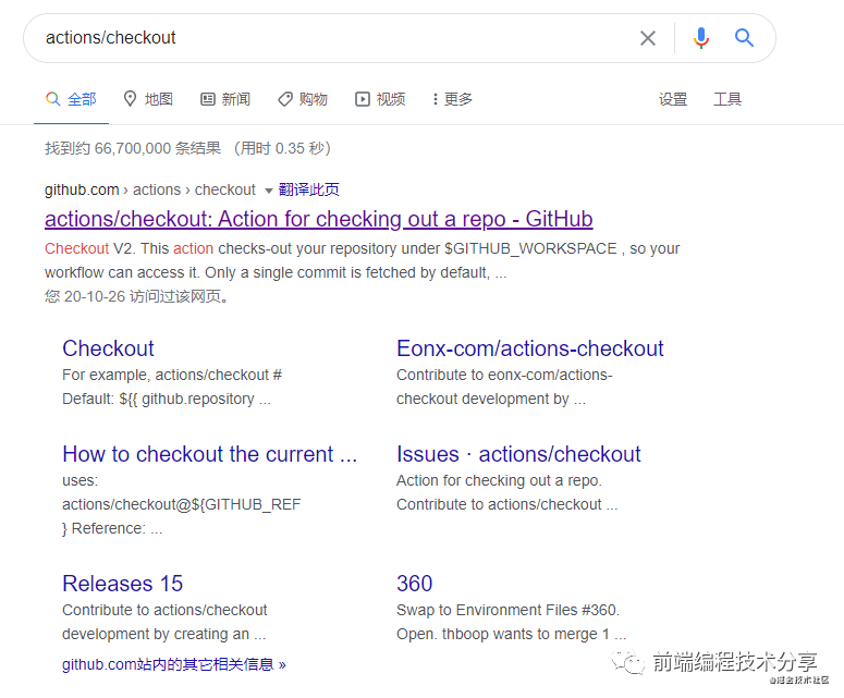 如果你想了解一下其他 actions 库的实现,可以直接复制 actions 库的名称去搜索引擎搜索一下,例如搜索actions/checkout的结果为: