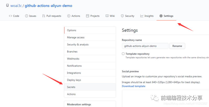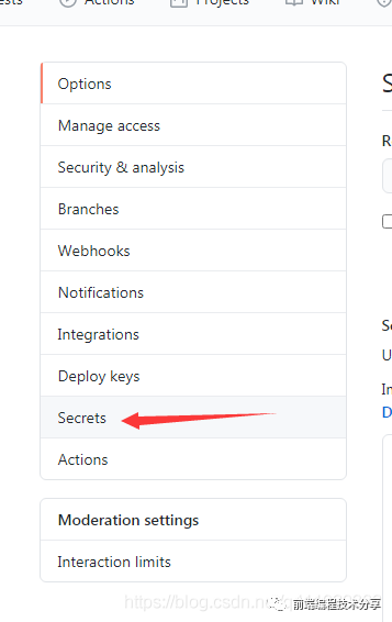 打开你要部署到阿里云的 Github 项目,点击 setting->secrets。
