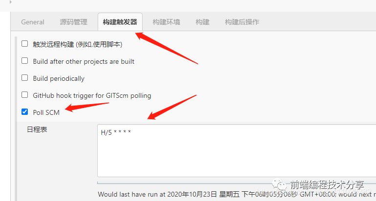 你也可以尝试一下定时构建,下面这个代码表示每 5 分钟构建一次。