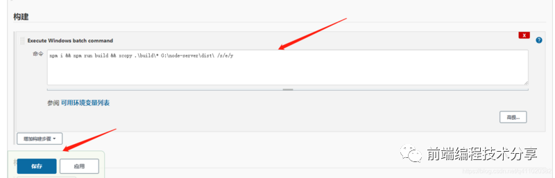 npm i && npm run build && xcopy .\build\* G:\node-server\dist\ /s/e/y,这行命令的作用是安装依赖,构建项目,并将构建后的静态资源复制到指定目录G:\node-server\dist\。这个目录是静态服务器资源目录。
