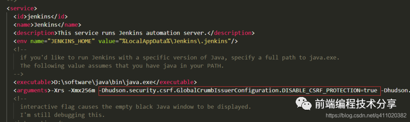 jenkins.xml文件,找到标签,在里面加上-Dhudson.security.csrf.GlobalCrumbIssuerConfiguration.DISABLE_CSRF_PROTECTION=true。它的作用是关闭CSRF验证,不关的话,Gitea 的webhook会一直报 403 错误,无法使用。加好参数后,在该目录命令行下输入jenkins.exe restart重启 Jenkins。