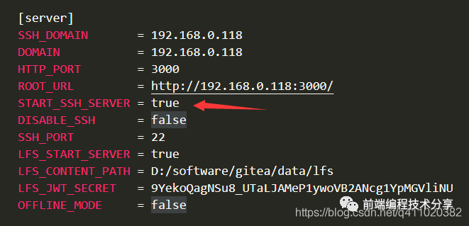 custom\conf\app.ini,在里面加上一行代码START_SSH_SERVER = true。这时就可以使用 ssh 进行 push 操作了。