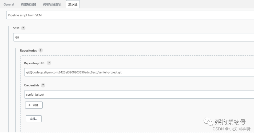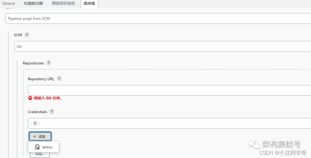2、直接进入流水线选项进行git配置2.1 添加凭证