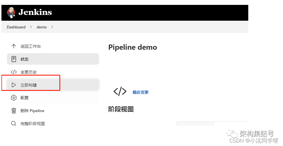 3、流水线进行构建演示3.1 进入我们自建流水线demo,点击立即构建