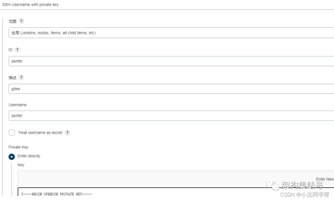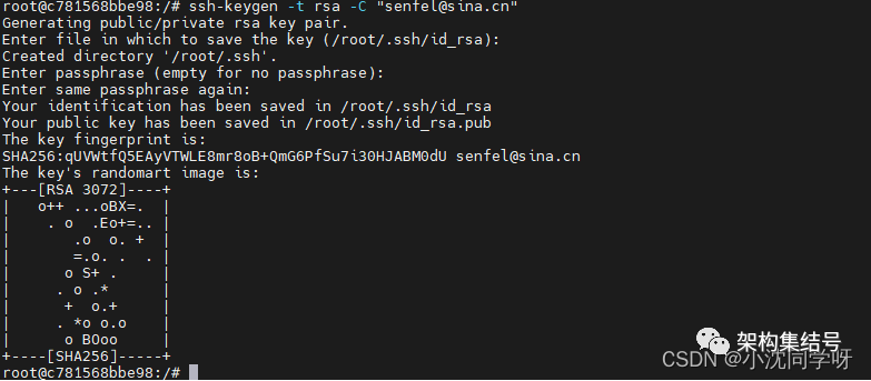 1、进入docker容器创建rsa[root@localhost app] docker exec -it jenkins bashroot@c781568bbe98:/ ssh-keygen -t rsa -C senfel@sina.cn后续步骤全部enter