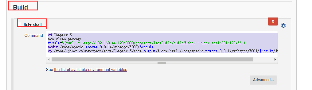 cdChapter15mvnclean packageresult=$(curl -s http://192.168.44.129:8080/job/test/lastBuild/buildNumber --user admin001:123456 )mkdir/root/apache-tomcat-9.0.14/webapps/ROOT/$resultcp/root/.jenkins/workspace/test/Chapter15/test-output/index.html /root/apache-tomcat-9.0.14/webapps/ROOT/$result/index.html