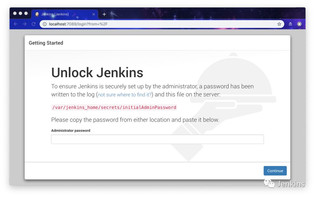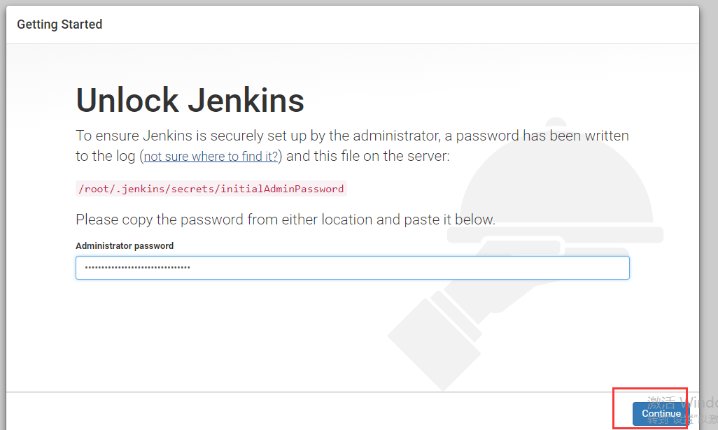 提示要到文件中查找密码并复制到输入框中。先回到SecureCRT中按 ctrl+c 退出jenkins服务,进入目录,查看密码,并复制:
