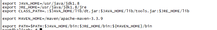 exportJRE_HOME=/usr/java/jdk1.8/jreexport CLASS_PATH=.:$JAVA_HOME/lib/dt.jar:$JAVA_HOME/lib/tools.jar:$JRE_HOME/libexport MAVEN_HOME=/maven/apache-maven-3.3.9export PATH=$PATH:$JAVA_HOME/bin:$JRE_HOME/bin:${MAVEN_HOME}/bin