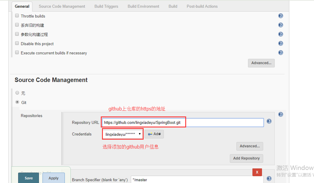 源码管理中branches to build 指定分支 $branch