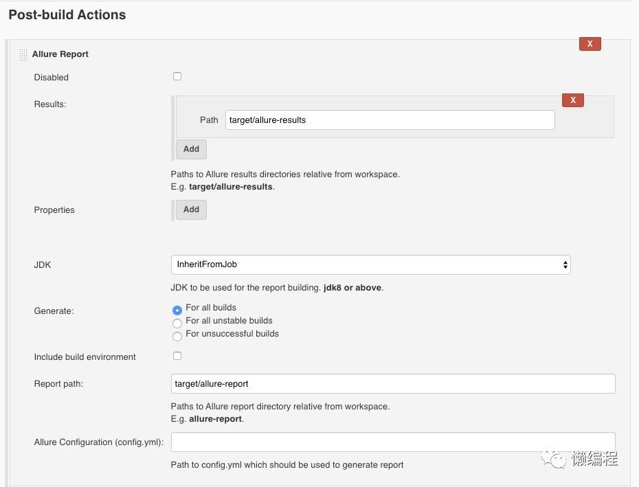 $ /Users/ayuliao/.jenkins/tools/ru.yandex.qatools.allure.jenkins.tools.AllureCommandlineInstallation/allure/bin/allure generate "/Users/ayuliao/.jenkins/workspace/allures report/target/allure-results" -c -o "/Users/ayuliao/.jenkins/workspace/allures report/target/allure-report"如果将 Results 与 Report Path 配置成其他值,会出现各种问题。