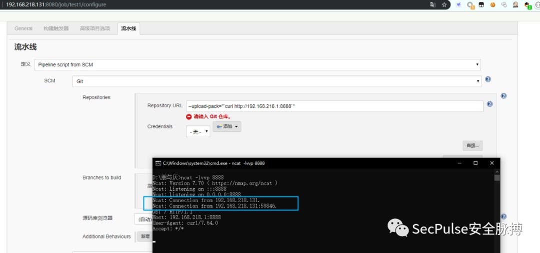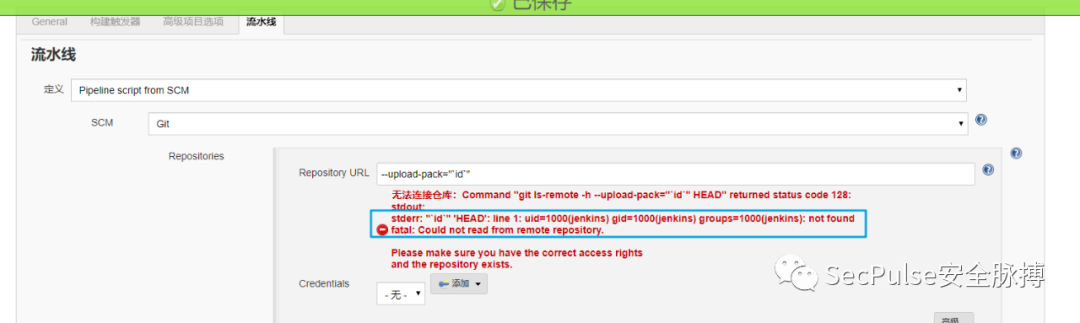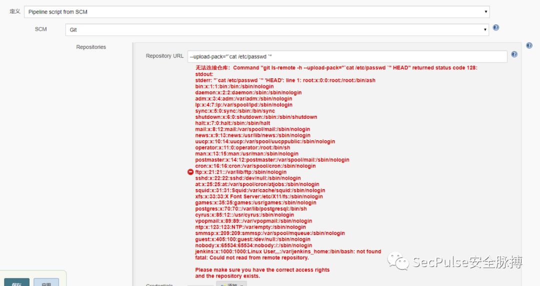 以官方描述https://jenkins.io/security/advisory/2019-09-12/,漏洞存在关键点在于git ls-remote,参考Git 客户端官方文档,从给的参数中可以注意到--upload-pack=。看起来像是可以执行某些命令,而漏洞作者也是看到了这个参数的形式而采用了这个参数执行。