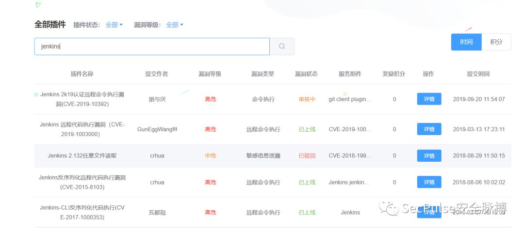 随着时间推移Jenkins后续也爆出了反序列化等漏洞,详情参见安全脉搏生态插件社区:https://x.secpulse.com//plugins