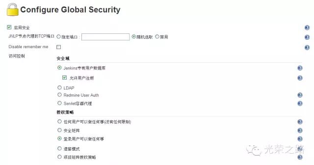 在已运行的Jenkins主页中,点击左侧的系统管理—>Configure Global Security进入如下界面:
