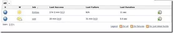 点击某1个job后后面的"Schedule a build"图片手动构建,点击完后,会在左边的Build Queue或者Build Executor Status显示正在构建的任务,在自动构建完后,刷新页面,就可以看到构建结果了,如何某个项目构建失败,点击项目后面的构建数字(从1开始递增)进入项目的"Console Output"可以查看项目构建失败的原因。当然我们也可以配置把构建失败的结果发到邮箱。