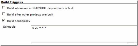 注:Schedule的配置规则是有5个空格隔开的字符组成,从左到右分别代表:分时天月年。*代表所有,0 12,20 * * *表示在任何年任何月任何天的12和20点0分进行构建。