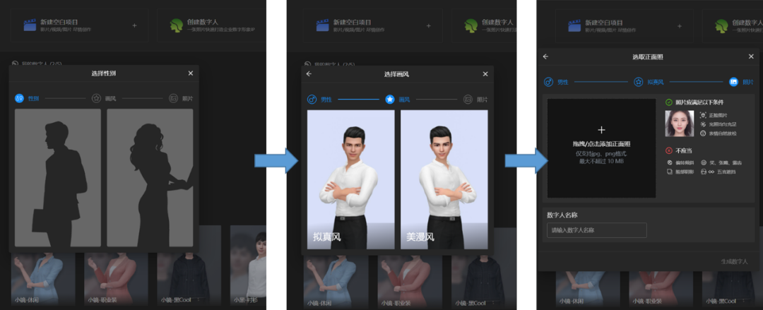 第一步:在任意一个浏览器中输入上述网址,就可以进入MetaMaker软件界面,点击左上方工具栏的创建数字人,根据自己的需求选择推荐的数字人,或者通过选择性别、画风、照片上传制作自己的数字人,如下图所示。
