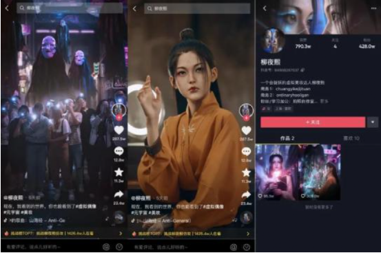 抖音账号柳夜熙10.31在抖音短视频平台发布第一条短视频《现在,我看到的世界你也能看到了虚拟偶像元宇宙美妆》后,获得310.3万个赞和13.6万个评论量,粉丝一天的增加幅度高达5135.5%。在视频中,一群人在围观一位古装女子对镜化妆,女子转过头后,独特妆容吓坏众人,只有一名小男孩上前问道:你是人吗?随后,这位自称是柳夜熙的女子,用手上的笔为小男孩开启天眼,小男孩看到了浮现在人群上方的鬼怪。在这条两分钟的视频里,画面、剧情、特效都有电影质感,虚拟人和现实人流畅交互,亦幻亦真,兼具赛博朋克和中式奇幻风格的故事就此展开。柳夜熙在视频中的人设是一个会捉妖的虚拟美妆达人,该视频抓住了10月31日万圣节节日热点、结合了最近横空出世的元宇宙概念、凭借美妆+虚拟偶像话题,引爆了视频获得关注度与话题讨论度。之后在11.1日柳夜熙账号发布了两张概念照,热度不断攀升,仅用数日就涨粉480万,这在短视频领域极其少见。