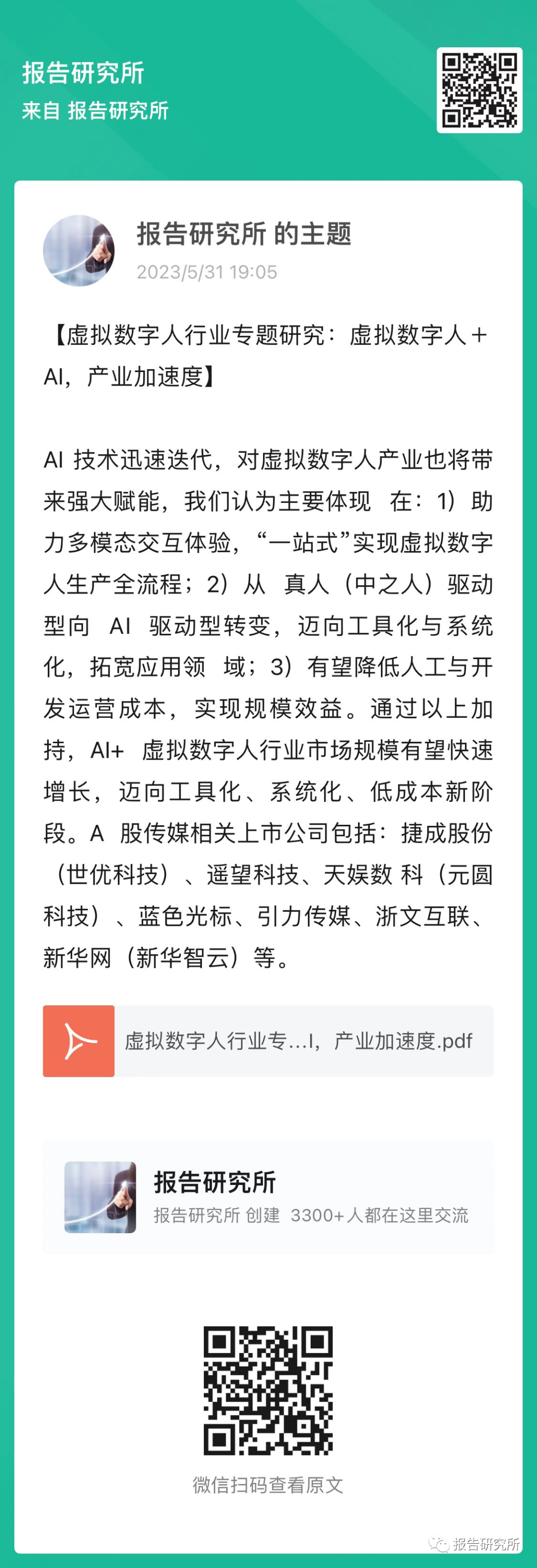 3、 成本转变:降低人力与开发运营成本,实现规模效益。首先,AI 技术助力完成文本、 图片、音视频等多模态内容的一站式智能化生成,有助于摆脱传统的中之人技术 对人力的依赖,降低人力成本。同时,随着底层架构的工具化与系统化,虚拟数字人开发 成本大幅下降,相关算法优化迭代也将降低运营传播成本。再者,此轮大模型变革催生出 的平台型基础技术架构,将大幅降低虚拟数字人的研发与推广成本,AI 交互技术门槛的降 低,也将带动 AI+虚拟数字人在多行业全领域的覆盖,实现规模效益。