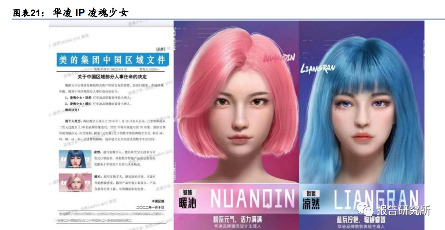 AIGC 可以根据品牌、产品或服务的特点和目标,自动生成各种形式的营销内容,如广告语、 口号、标语、海报、视频等,并根据不同的市场、竞争对手和用户画像,调整内容的策略、 方向和效果。可提高营销内容的创意、针对性和转化率,同时降低营销成本。在 AIGC 和 ChatGPT 技术的加持下,虚拟数字人可变身为企业的数字员工,通过与各应用场景持续深 度融合,成为企业降本增效的重要帮手。升级企业品牌代言,提升品牌影响力。华凌作为专注跟年轻人打交道的年轻家电品牌,抢 先占领了家电市场的元宇宙赛道。华凌为美的集团旗下面向年轻人群体的品牌,从 2019 年 就开始布局虚拟现实应用,探索年轻消费者的独特审美品味与消费需求,实现品牌与年轻 消费者的深度互动,并打造了凌魂少女作为品牌的形象代言人,与前卫先锋、年轻躁 动的 Z 世代消费者打成一片。而如今面对元宇宙的新数字化趋势,华凌进一步布局自有品 牌 IP 的数字化升级迭代,从二次元进阶为超写实虚拟数字人,始终以虚拟数字人凌魂少 女形象统领企业从产品端到消费者使用端的体验,通过商业、营销、产品应用,创新呈 现品牌智能家居形象,为企业创造营收。