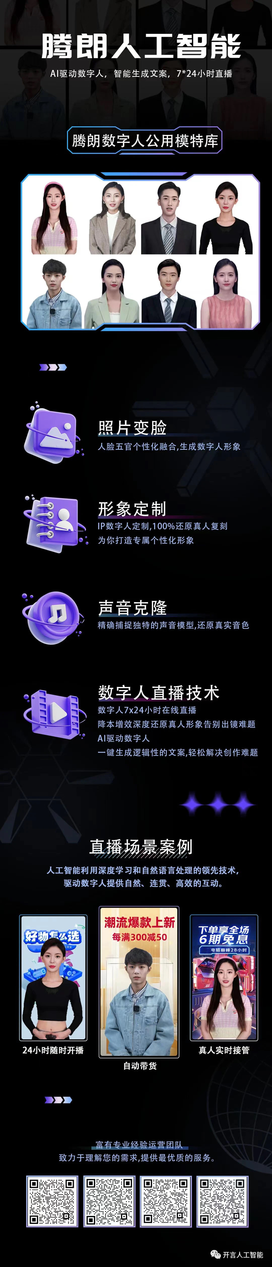 腾朗人工智能科技有限公司已经落地基于ChatGPT驱动的领先数字人技术,致力于为客户提供优质的数字人服务。感兴趣的朋友可以添加企业微信进行咨询。