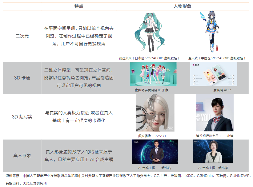 从人物图形维度,从外形上可分为卡通型、写实型两大类的虚拟数字人,具体而言有以下四种: