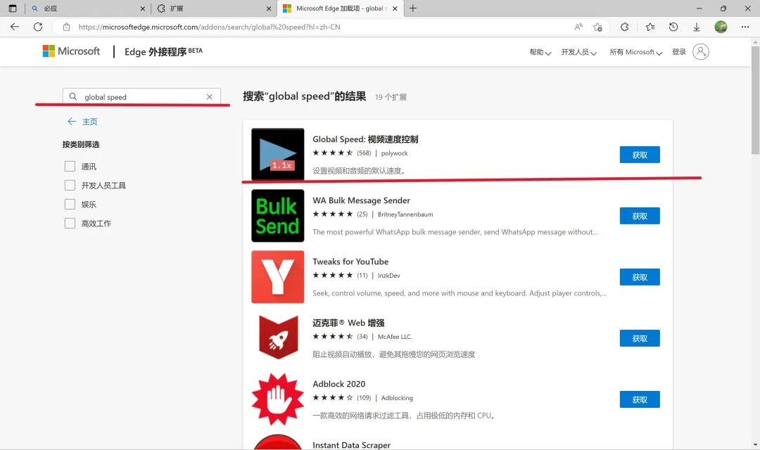 进入Microsoft Edge 扩展界面。在搜索框输入 Global speed。
