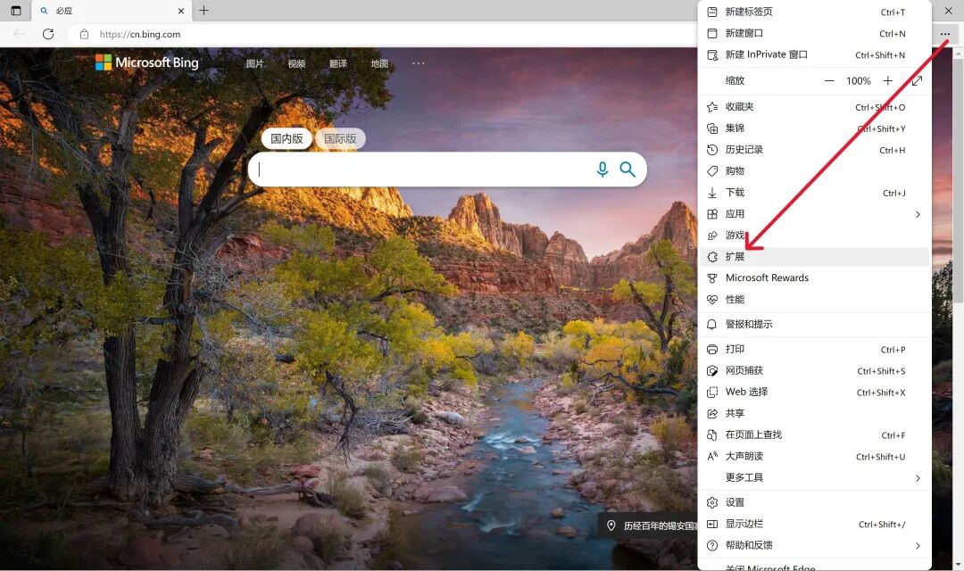 首先,打开Edge浏览器,点击右上方三个点,点击扩展。