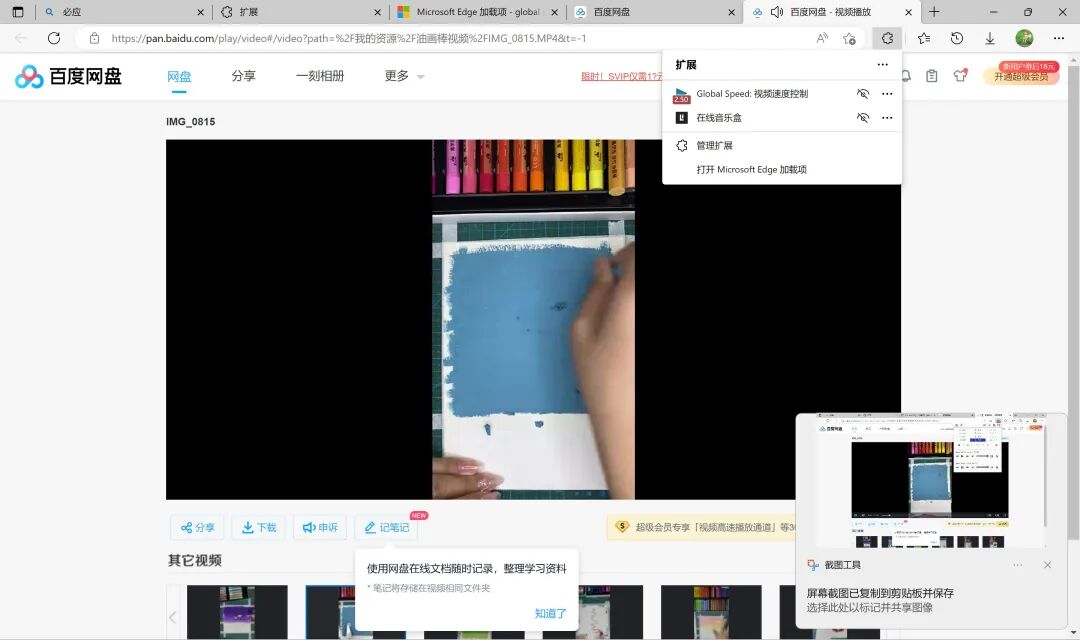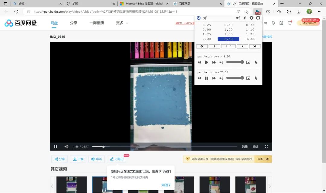 ①点技巧Edge浏览器免费倍速播放网盘视频