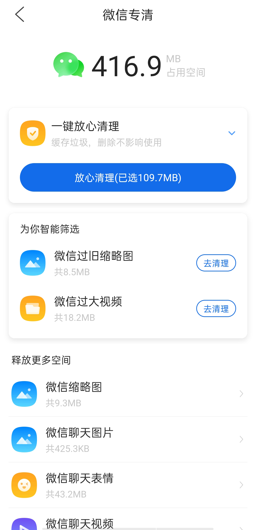 在「微信专清」中,你可以对日常聊天中缓存的无用垃圾、历史久远的垃圾进行清理,既能轻松释放内存,又不影响微信的使用~