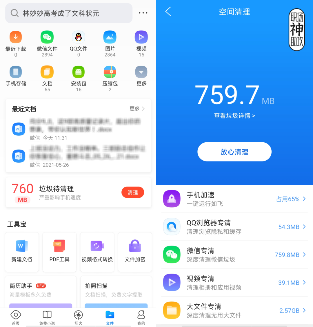 在【文件】中,你可以对手机垃圾进行智能检测、批量删除、一键清理,速度快到飞起!