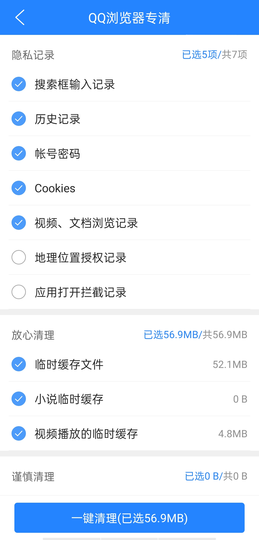 比如在「QQ 浏览器专清」中,你可以清理搜索记录、历史记录、浏览记录、账号密码等,保护自己的隐私安全和账号安全;