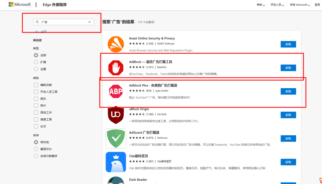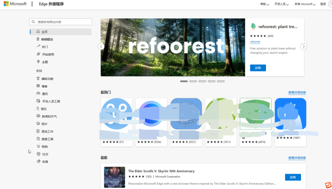 如图所示,这就是edge浏览器的扩展商店,当然edge官方的名字叫作外接程序,其实这就是扩展或者插件的不同叫法。