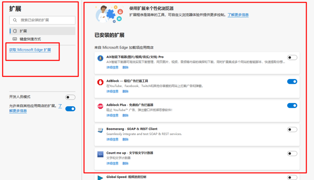 右侧是已经安装了的扩展,左侧是搜索扩展和访问edge的扩展应用商店。