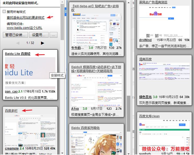 我们下载插件,在支持的浏览器中安装。然后我们先测试百度美化,点击插件查找适合此网站的更多样式(注意并不是所有网站都支持),会发现提供一些素材,比如搜索结果去广告、文库、知道、贴吧精简,还有各种界面精简美化等,我们选择其中的百度轻和多栏素材安装。