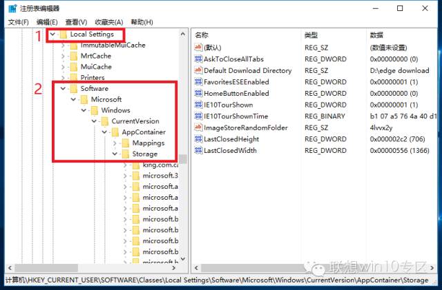 3、接着往下定位:Local Settings\Software\Microsoft\Windows\CurrentVersion\AppContainer\Storage