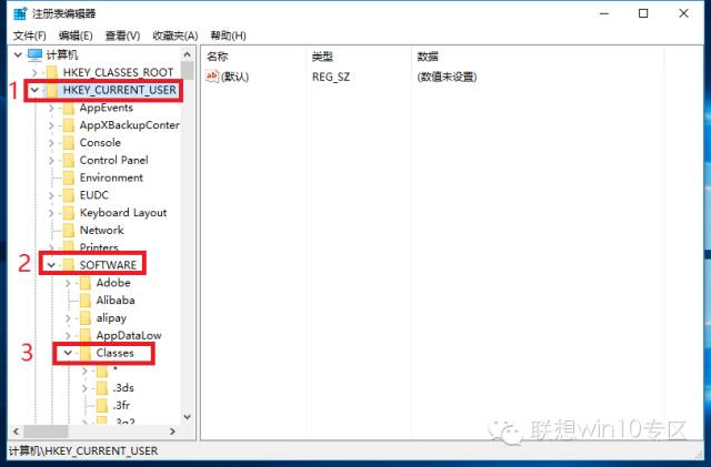 2、定位到HKEY_CURRENT_USER\SOFTWARE\Classes