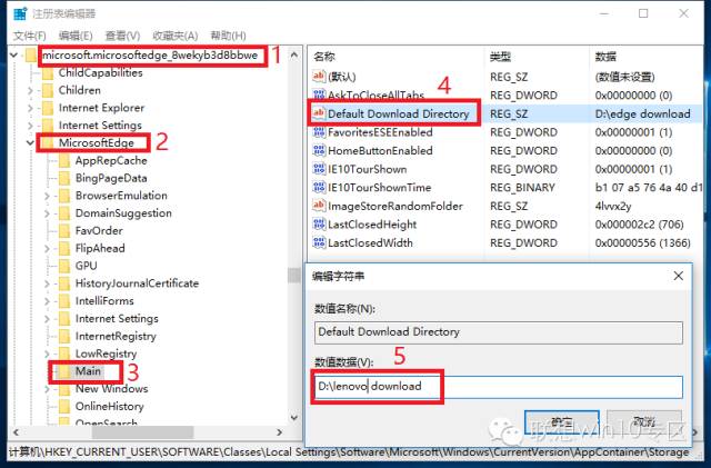 4、继续定位:microsoft.microsoftedge_8wekyb3d8bbwe\MicrosoftEdge\Main,在右边空白处单击右键,创建新的字符串值,命名为Default DownloadDirectory,然后在注册表数值数据中输入你想设置的下载路径D:\lenovodownload,点击确定: