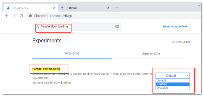 2.然后在搜索输入框 Search flags 处,输入 Parallel downloading ,并在电脑上按回车键,等搜索的英文变成黄色背景时,将右侧的预设值改成Enabled,接下来点 Relaunch 重启就完成设置了。