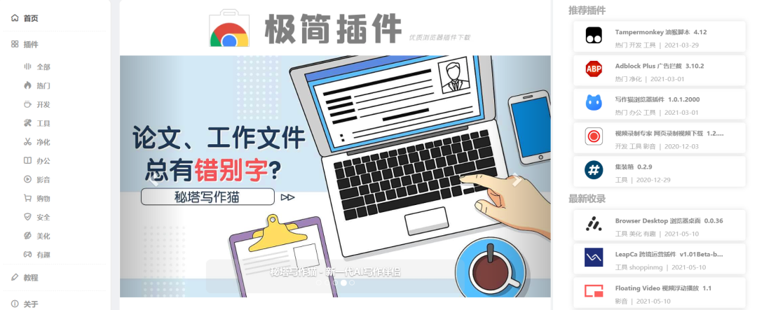 大伙可以把极简插件当作谷歌应用商店的镜像网,进入网站就能看到,里面的插件非常丰富。