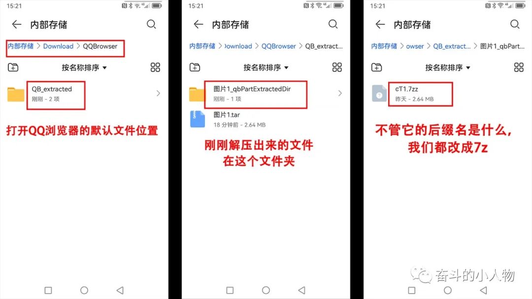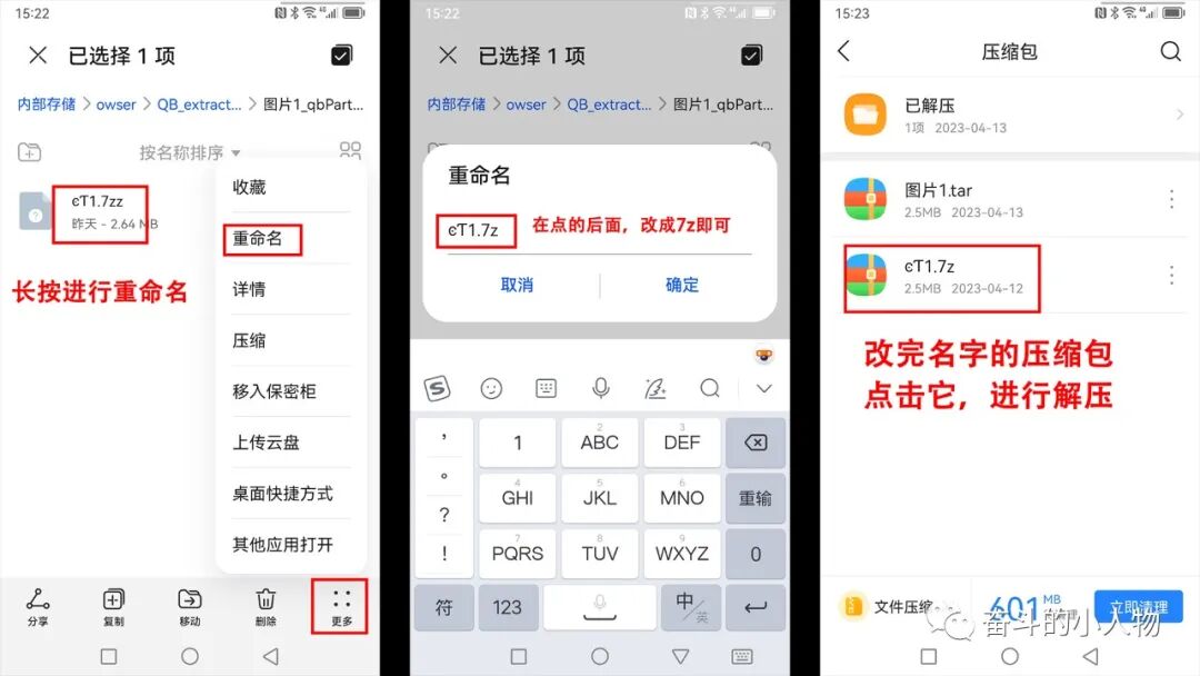 回到文件管理器,打开QQ浏览器的文件保存位置,我们可以看到多了一个刚刚解压出来的文件夹,点进去可以看到一个不像是压缩包的文件,没有关系,我们长按它,进行重命名,不管它的后缀名是什么,我们统统改成7z。