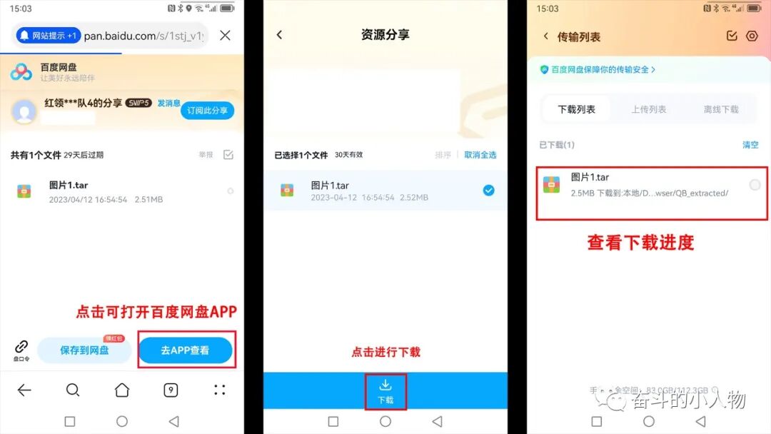 在浏览器中点击别人分享的百度网盘链接,然后点击右下角的去APP查看,点击下载就可以了。回到传输列表中,可以看到下载的速度与完成情况,到这里,百度网盘下载文件的方法就结束了。