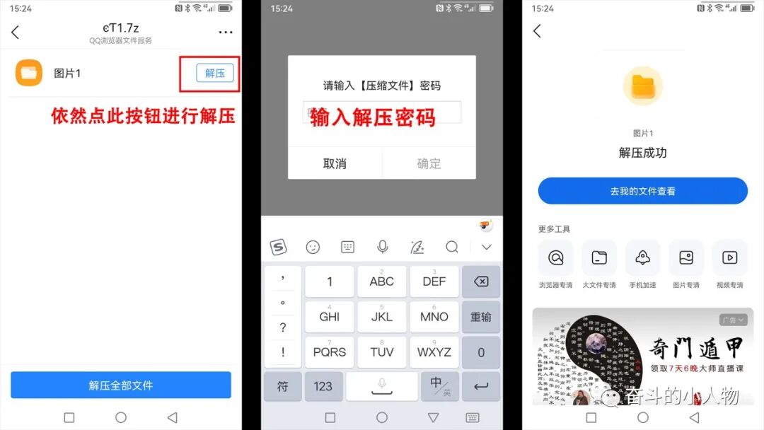 再次回到QQ浏览器,在文件管理的压缩包里,可以看到多了一个7z的压缩包,我们点击它进行解压(有解压密码的输入解压密码),然后依然是点击文件旁边的解压按钮,切记不要点解压全部文件,再次输入解压密码,等待解压完成即可。