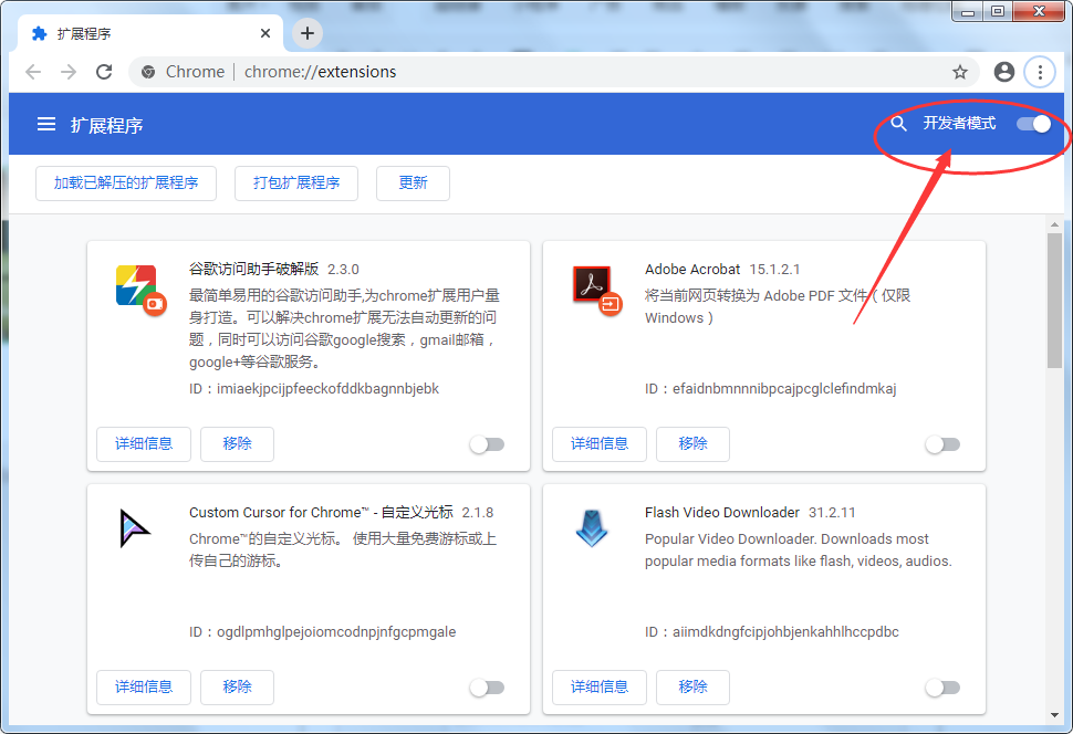 2、点击右上角的开发者模式。将已经下载好的.crx扩展文件拖入到浏览器中,或者点击添加扩展程序即可安装完毕。