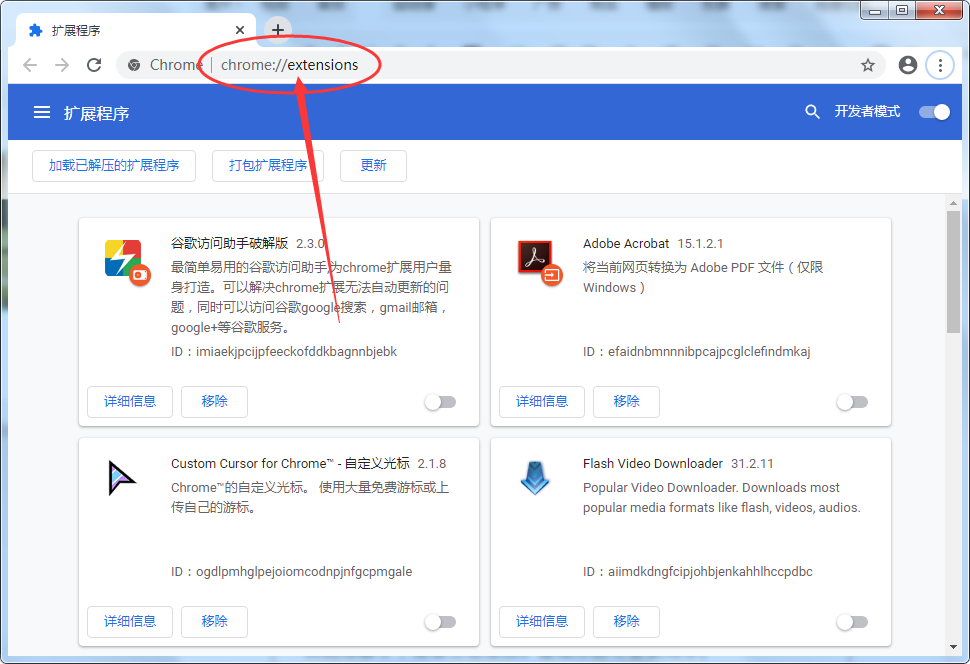 1、打开google浏览器,在地址栏输入chrome://extensions/进入扩展安装界面,如下图。