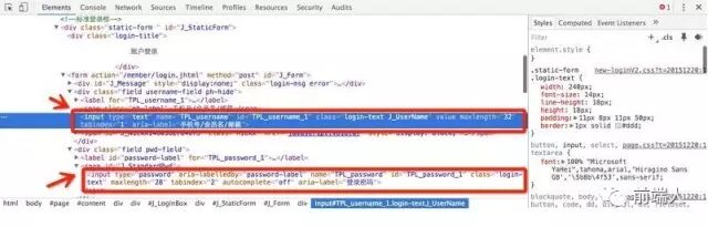 通过页面DOM树的查看,我们得知用户名和密码输入的Dom标识。