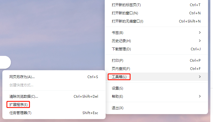 我们点击右上角的设置,点击工具箱,打开扩展程序。