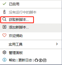 点击油猴的插件图标,会跳出这个界面,选择获取新脚本,会出来一个下载脚本的地方。