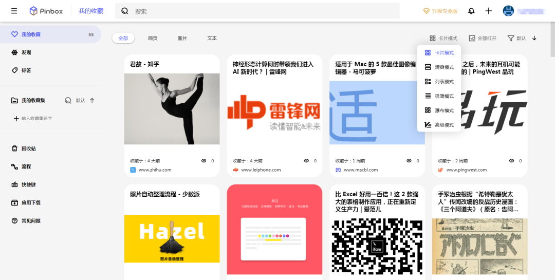 Pinbox提供了丰富的显示模式,并提供了全面的收藏管理功能,界面设计简约、直观。
