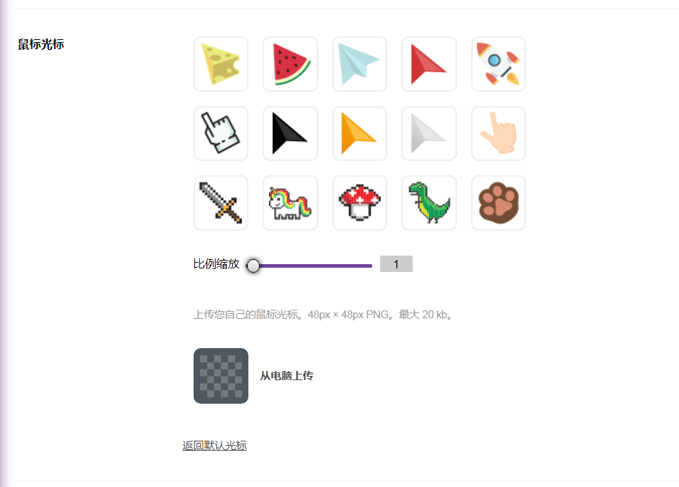除了设置鼠标手势之外,我们还可以通过crxMouse手势更换鼠标样式。在插件中不仅自带了一些鼠标样式,甚至还可以自行上传自己制作的鼠标样式。